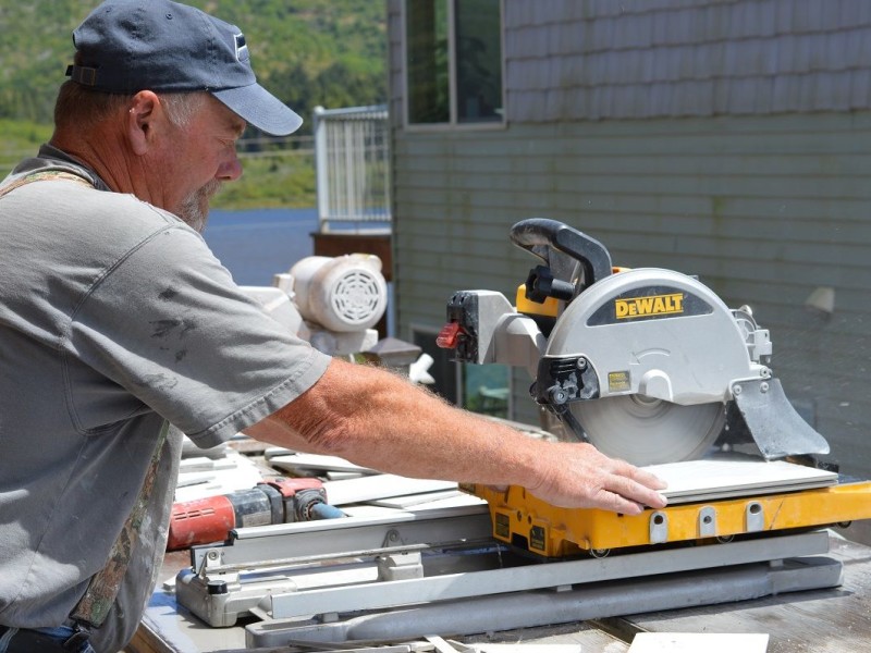 Toby is carefully cutting the large master bath tiles that are being installed in this Rockaway Beach remodel. Precision is key for the pristine finish JLT Construction delivers!