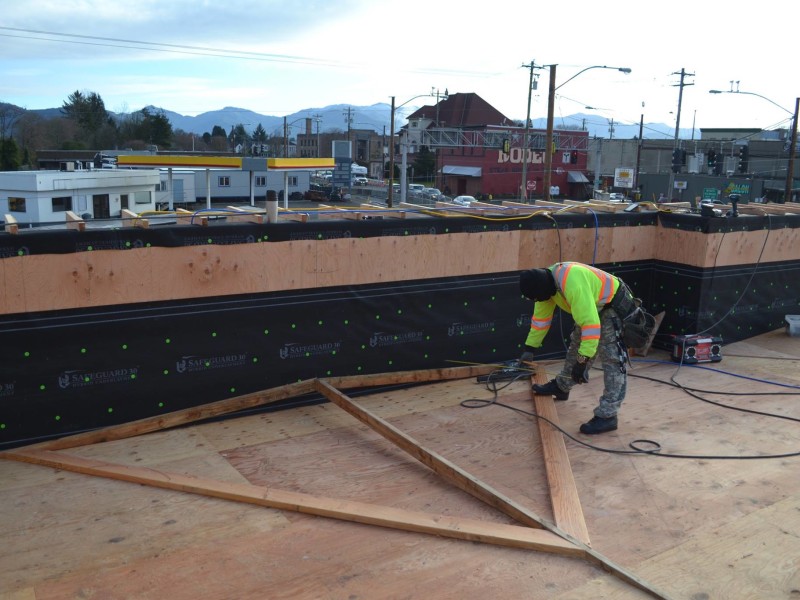 Building crickets on the roof of the new America’s Mattress store in Tillamook.