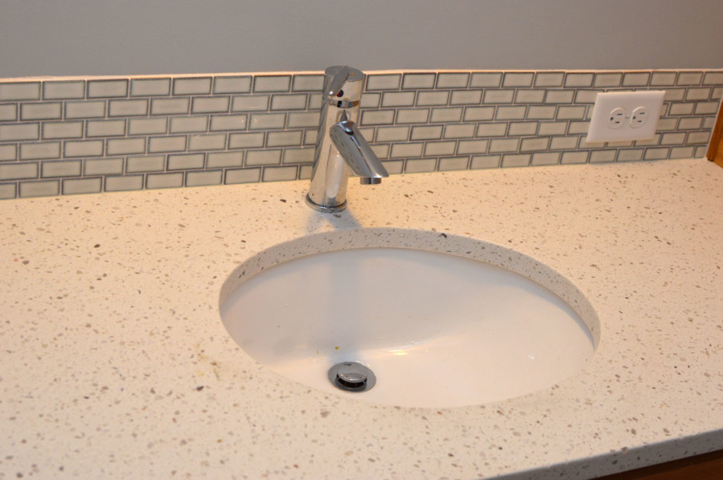 Check out the perfect harmony of elements built into this bathroom countertop. Now we just need to add the mirror for the final touch. You’ll also notice that the backsplash here matches the backsplash in the kitchen shown in an earlier post.