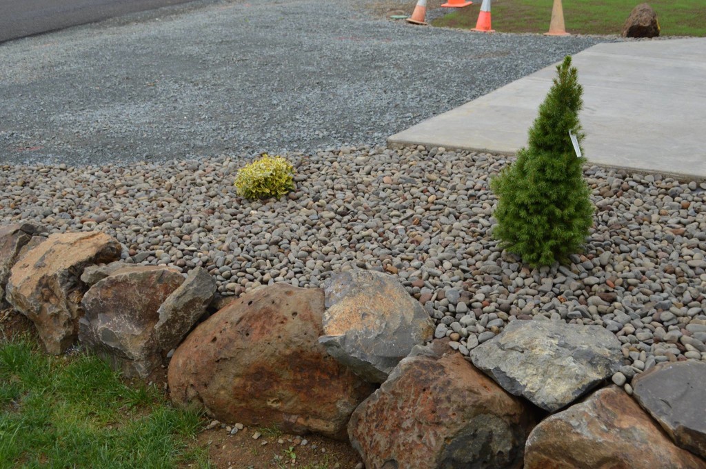 The landscaping on the new spec home includes the addition of boulders for edging and river rock for the beds. Simple, yet looks fantastic.