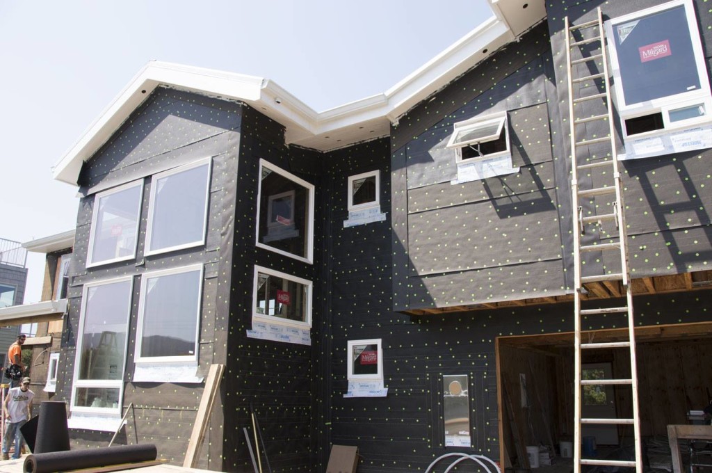 JLT Construction puts sheathing on this home to prep before the siding is installed. Excellent weather conditions have been a huge help in getting this project buttoned up.