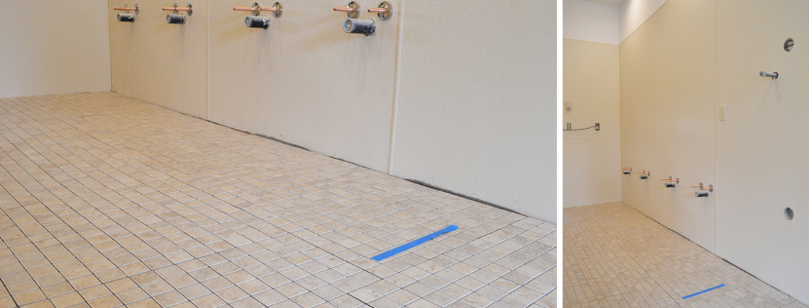 The group showers at Shorewood Lodge, recently laid with new 2×2 tiles.