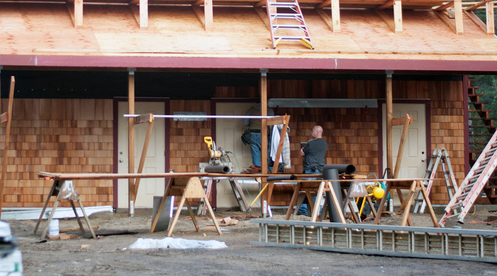 We’ve come a long way on the Camp Magruder lodge project – The cedar shingles are almost completed!