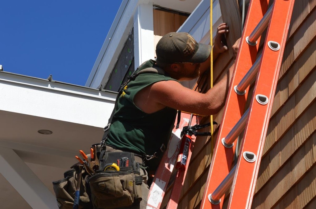 Bill checks the siding alignment one more time to be sure everything lines up accurately.