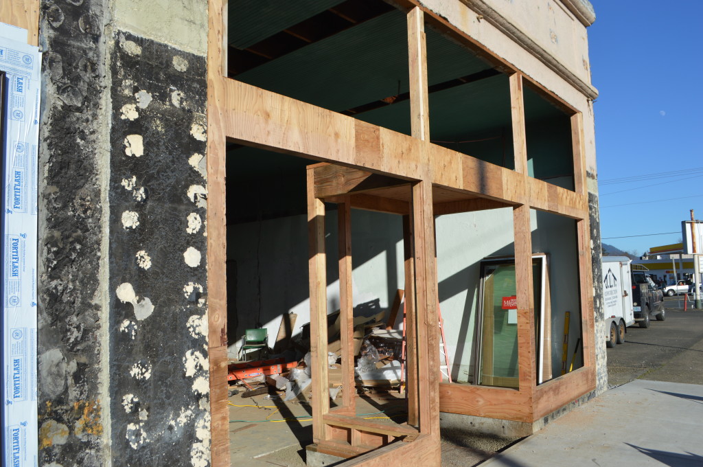 Our renovation, of Tillamook’s 1st Street commercial building, is steadily progressing. All the framing is nailed in and we’re ready for some windows!