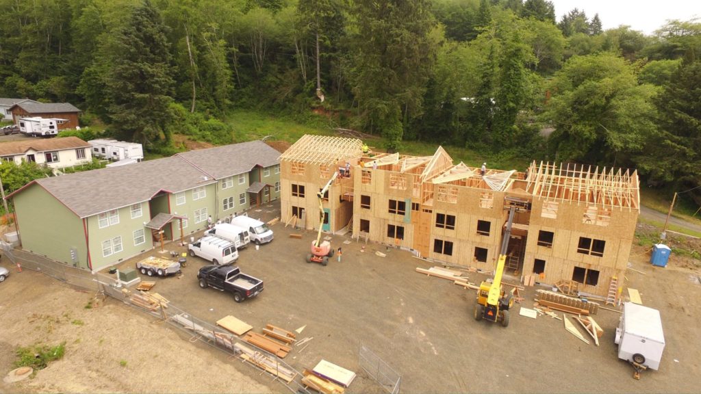 Beautiful aerial shot of the trusses being installed on the third story of building #3 at the new Garibaldi apartment project.