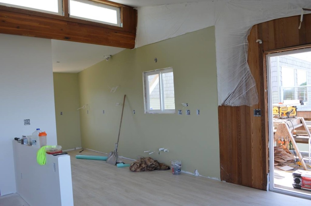 The kitchen paint color is on the walls and the light wood laminate flooring is being installed in this home remodel by JLT Construction. The color choices create a warm woodsy feeling and the light flooring keeps the room from being too dark with contrasting wood on the walls. Nice job!